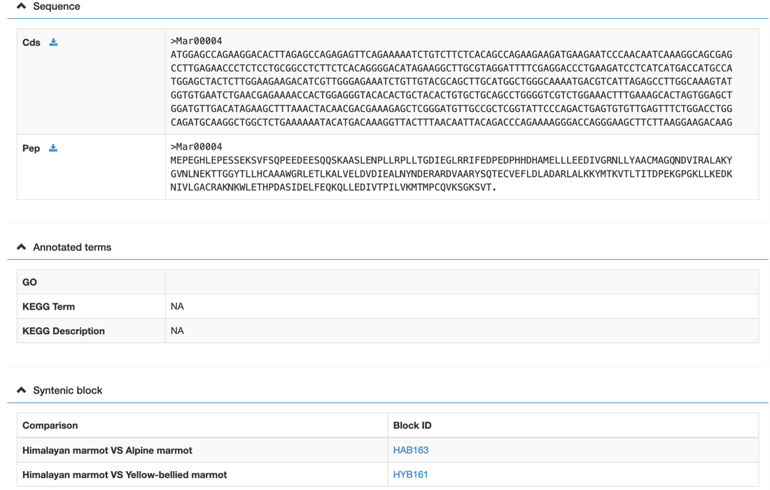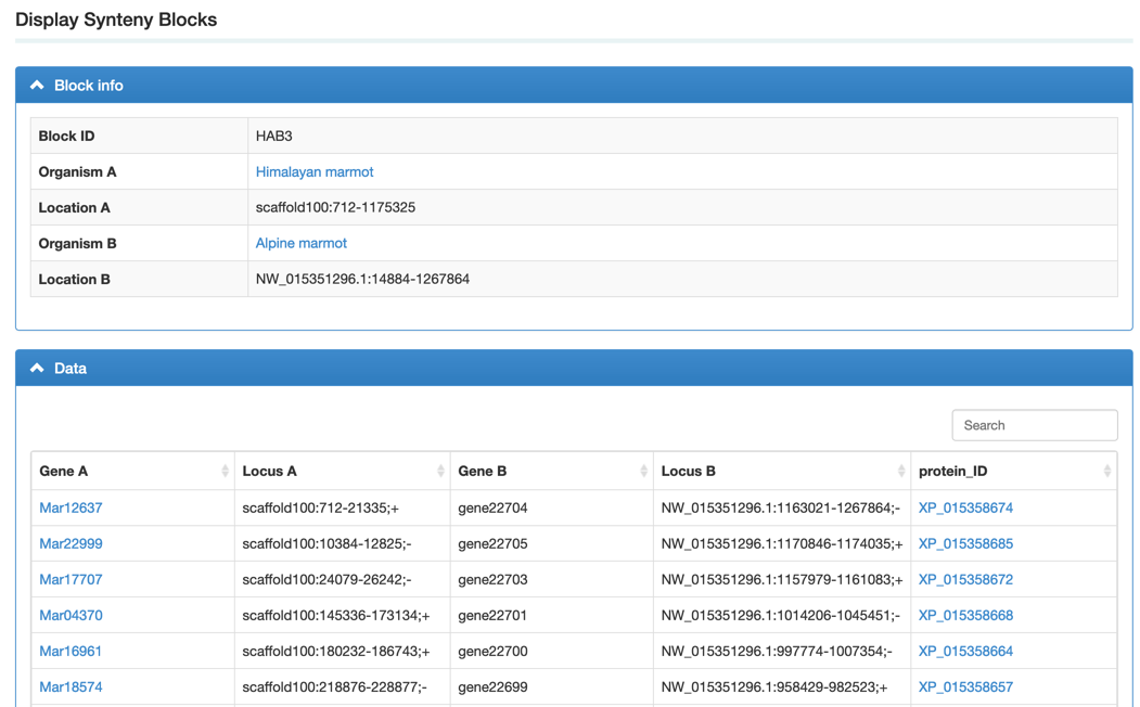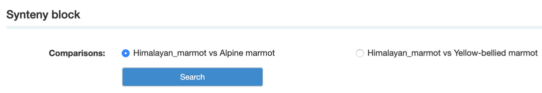 By using Browse, database user could also view the synteny blocks between Himalayan marmot and other two marmots: Alpine marmot and Yellow-bellied marmot.