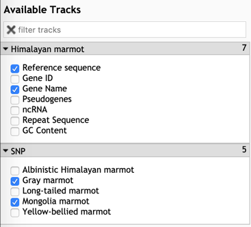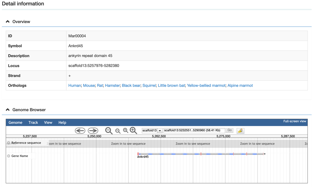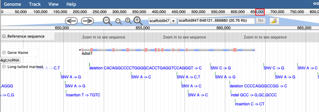 Step2: Type the gene ID or scaffold region to view the gene model and the genomic variations within this gene in other marmots.