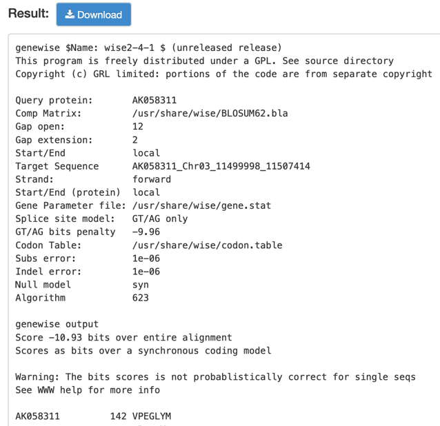 GeneWise is a Pairwise Sequence Alignment tool and compares a protein sequence to a genomic DNA sequence, allowing for introns and frames-shifting error. It provides highly accurate and sensitive predictions of gene structures.