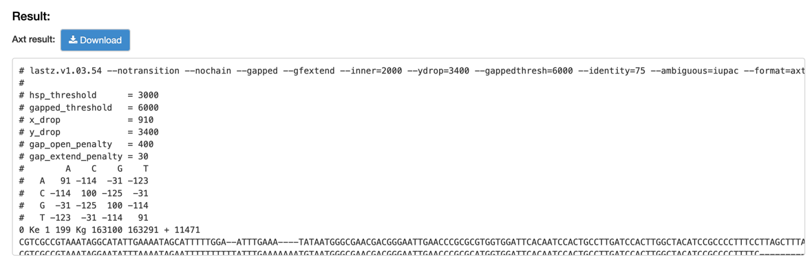 Lastz (Large-scale genome alignment tool) is a fast and powerful alignment tool for the pairwise alignment of genomic DNA sequence. LASTZ was designed with large-scale genomic analysis and can efficiently align chromosomal or genomic sequences millions of nucleotides in length. It identifies orthologous regions between genomic sequences on a massive scale using a methodology that ignores the coding-region bias.